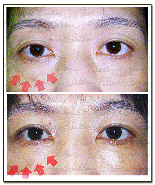 1. 適當取眼袋及皮膚之後,做自體脂肪臉部移植於手術可能凹陷處(上圖), 可以改變的程度及部位會比較大,滿意度也較高(但是醫師的心中都會有點抗拒,怎麼說呢?其實醫師都會在心中要求要用一個手術方式解決客人的所有問題,但是 事實上老化是牽涉到很多結構同時改變的,只是增加皮膚的提升及緊緻,有時還是不夠的,需要同時讓“消風”的組織變得飽滿,才能真的修正成一個年輕的容貌。