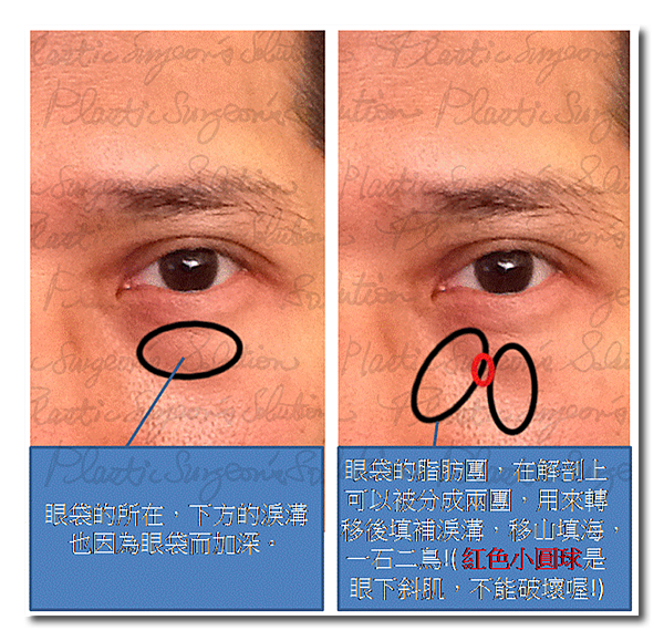2. 若是有半大不小的眼袋,但是也不喜歡淚溝太明顯,皮膚沒有很鬆的情況下,我建議可以內開眼袋,(以及/或)選擇利用眼袋脂肪移位到淚溝做局部填補(下兩圖是解說與實例),但因為眼袋較小,脂肪較少,要先預告客人的結果(有可能不能填到完全平整)。