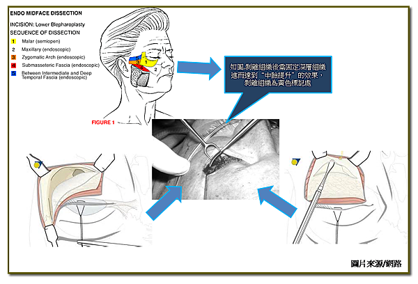 b.中臉提升(由下眼袋皮膚切口進行)(大陸人講“提升”, 我們是說“拉皮或拉提”):這個手術是從下眼袋切口進入後,進到比較深層的組織,整片組織(下圖)底下都分離,再將下垂的中臉部分做一個程度的提升與固定,方向就是沿著嘴角往外眼角的方向提拉,目的是把蘋果肌、法令紋…這整個下垂的區塊往上拉起,做出年輕的效果