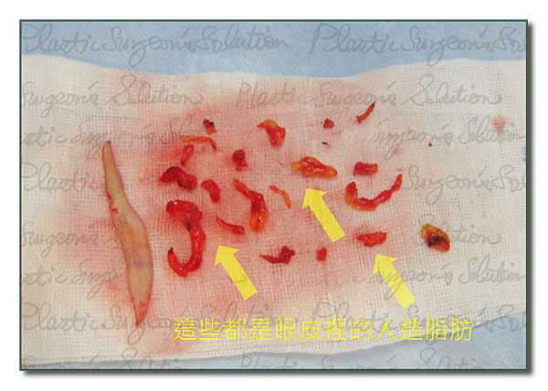 我曾看過早期號稱動物脂肪(其實是古早的人造脂肪)、雅得媚Aquamed以及殘 留玻尿酸等填充物注射在上眼皮,有短暫造成的水腫不退長達半年,也有十幾年前注射的黃色脂肪殘留,但手術共通處都是要小心移除注射物的同時,不能同時移除 珍貴的眼輪匝肌、眶隔脂肪,這兩個部分扮演了使眼周年輕化及眼皮褶順利成形的重要角色!!缺一不可!!!若是非得徹底移除,便要執行適當的脂肪移植甚至皮 瓣手術來進行眼皮重建,處理上不可不慎啊!!!