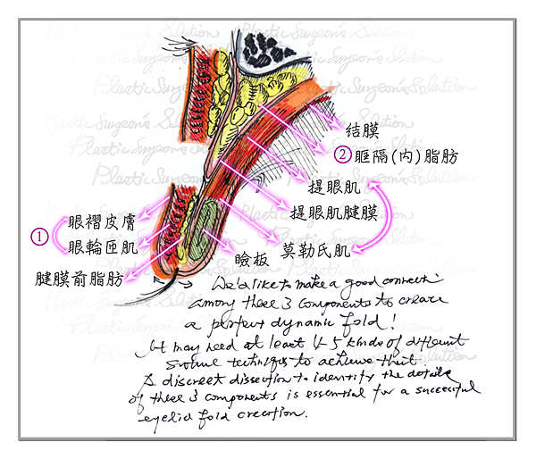 “找到提眼肌腱膜與瞼板,做好這兩個東西與皮膚的連結”